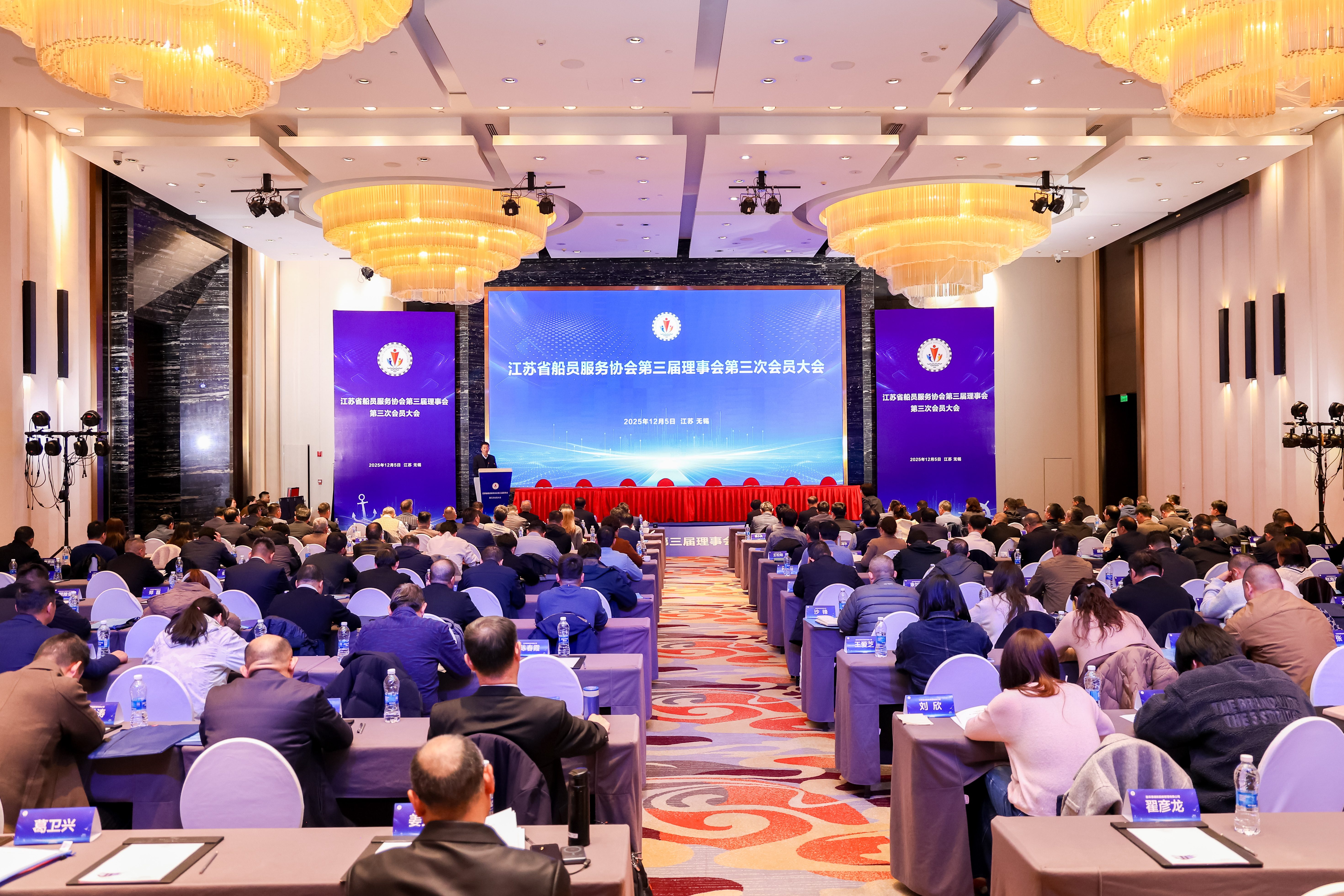 2025年12月5日,江苏省船员服务协会第三届理事会第三次会员大会在无锡太湖皇冠假日酒店隆重举行。来自全省会员单位150余人参会,江苏海事局二级巡视员郑跃峰、江苏省造船工程学会理事长方建华、南京下关滨江商务区党工委书记徐晓华、无锡交通高等职业技术学校党委书记李进、江苏海事局船员管理处处长吴云锦、考试中心主任李泽兵、连云港海事局船员管理处副处长陶磊以及江苏海事局各分支机构有关领导、南京市第一医院党委委员副院长邵渊,中国交通报、中国水运报等媒体记者应邀出席。