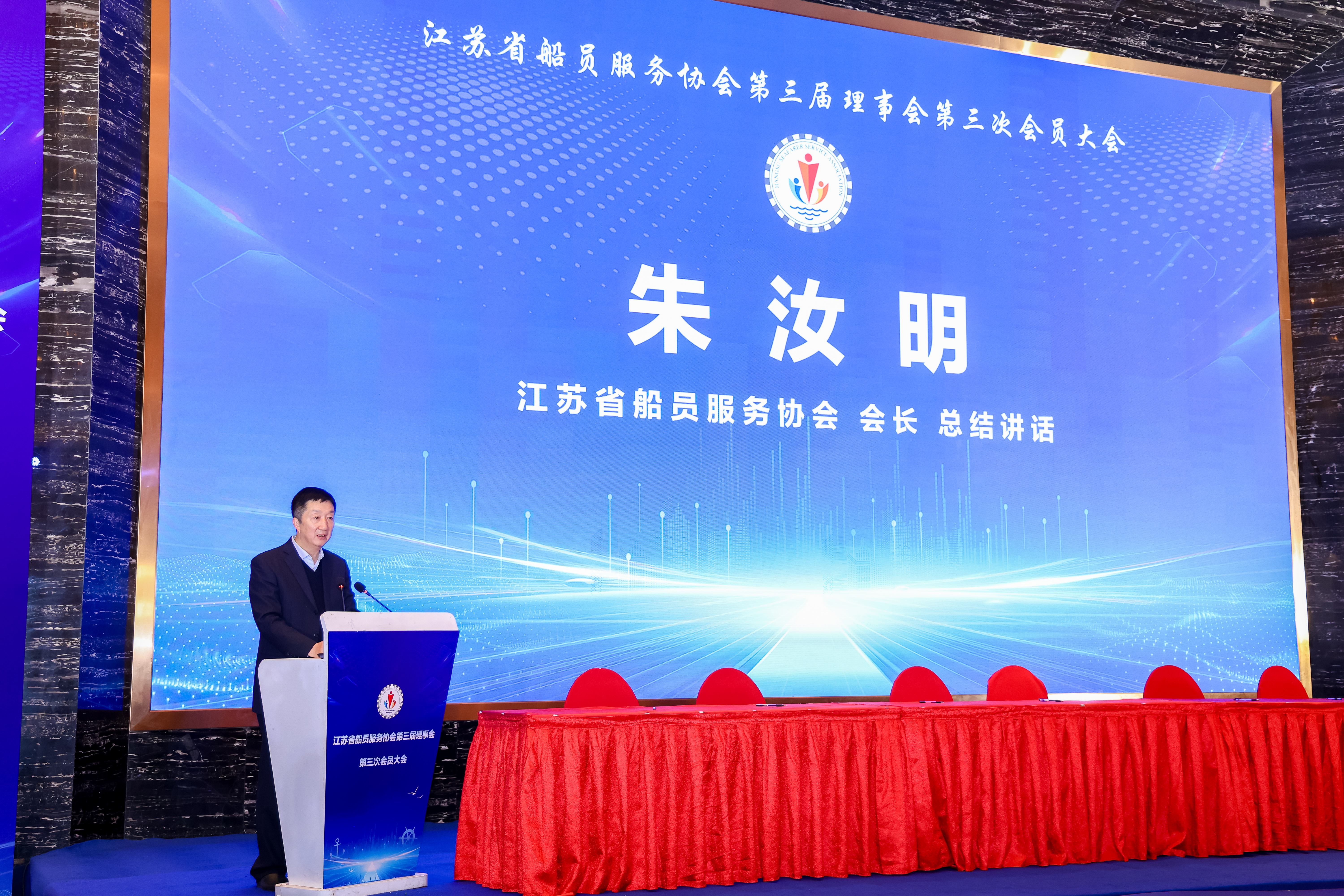 大会在圆满完成了各项议程后,新任会长朱如明做了总结讲话,他以一个核心,两个支撑,三大体系,四项重点”,阐述了下一阶段的工作构想,即以服务会员、赋能行业为核心;夯实人才与科技“两个支撑”;构建精准化的政策传导与权益维护、标准化的行业自律与诚信管理和多元化的资源共享与协同发展“三大体系”;重点做好船员职业吸引力提升、服务能力提升、推进协会工作改革和对外交流与合作“四项重点”工作。他表示理事会将坚持习近平新时代中国特色社会主义思想为指导,团结带领全体会员,以更加饱满的热情、更加务实的作风、更加昂扬的斗志,凝心聚力,开拓创新。在上级主管部门的指导下,在全体会员的共同努力下,推动江苏省船员服务事业迈上新台阶,为水运江苏、交通强国、海洋强国建设贡献协会力量